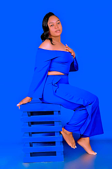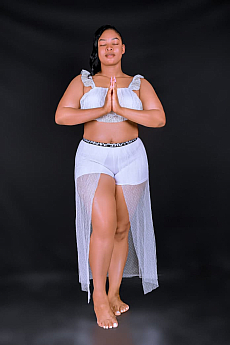 The first thing you notice is her gaze. Zoe looks at you with cool blue eyes that don’t flinch, while dark brown hair falls in a soft curtain over her shoulders. Her curves are outlined in all the right places, and there is a calm confidence in the way she stands that makes your pulse move first.